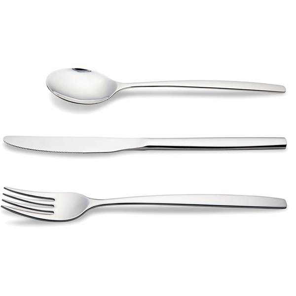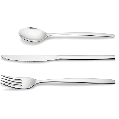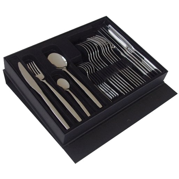Em aço inoxidávelComposto por 6 facas, 6 garfos, 6 colheres de sopa e 6 colheres de sobremesa