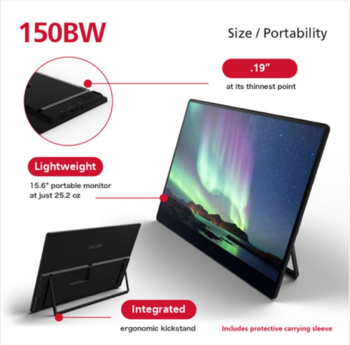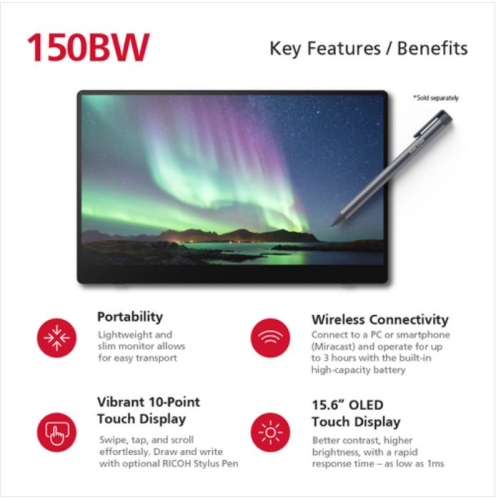 Leve a produtividade e o conforto aonde quer que você vá com o modelo sem fio leve, nítido e versátil RICOH Portable Monitor 150BW.