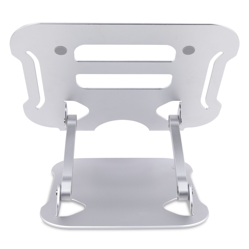 O riser do laptop possui acabamento anodizado prateado com construção em alumínio para garantir durabilidade e robustez. A área de superfície ventilada é elevada para promover resfriamento passivo e fluxo de ar. O espaço abaixo da plataforma do laptop pode ser usado para armazenar teclado, mouse e/ou outros acessórios e periféricos quando não estiverem em uso.