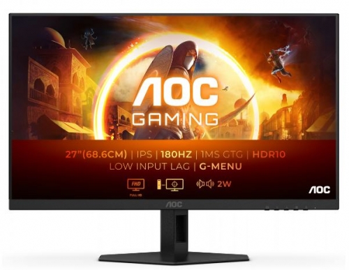 AOC 27G4XE. Tamanho do ecrã na diagonal: 68,6 cm (27"), Resolução: 1920 x 1080 pixels, Tipo de HD: Full HD, Tecnologia de apresentação: LCD, Tempo de resposta: 0,5 ms, Proporção de imagem nativa: 16:9, Ângulo de visão (horizontal): 178°, Ângulo de visão (vertical): 178°. Altifalantes incorporados. Suporte VESA. Cor do produto: Preto, Cinzento