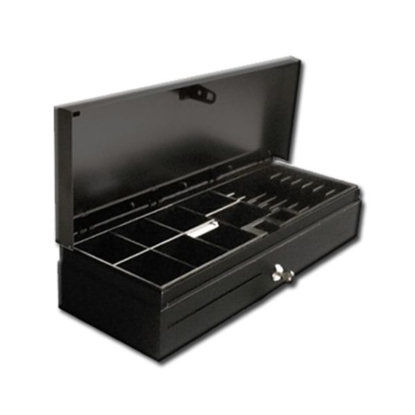 Gaveta Metálica Abert e Fecho c Chave 2x Ranhuras Frontais 8x Moedas 4x Notas 410(l) x 415(C) x 100(A)mm 114mm c pês Ligação á impressora RJ11 Preta - HS-410A