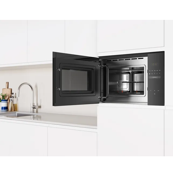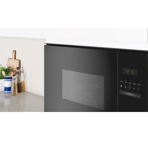 25 l capacidade Série ?Vidro?, Microondas sem aro Instalação em coluna de 60cm de largura Controlo eletrónico Controlo deslizante totalmente integrado no vidro Aqualisis: sistema de limpeza simples, económico e ecológico Relógio eletrónico com programação de duração e fim de confeção Potência: 900 W Potência do grelhador: 1200 W. Funcionamento combinado micro-ondas + grill 5 nÃveis de potência: 900 W, 600 W, 360 W, 180 W, 90 W 8 programas automáticos de confeção e descongelação por peso 1 memória programável Interior em Inox Iluminação interior por LED Acessórios: Grelha, Prato rotativo 31.5 cm em vidro Cor: Preto