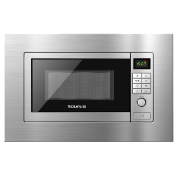 TAURUSMICRO ONDAS TAURUS - ELBRUSMICRO ONDAS TAURUS - ELBRUSMicro-ondas encastrável em aço inoxidável | Capacidade de 20L | 5 níveis de potência | Função grill (espeto incluído) | 2 combinações (grill + micro-ondas) | 9 menus automáticos | Programável | Função de descongelação por peso | Compartimento interior em aço inoxidável | Porta de abertura automática | 700 W - Potência das micro-ondas | 900 W - Potência do grill | Temporizador (regulável para 35 min) | Plataforma giratória de Ø24.5 cm | Adequado para instalação em móveis altos/coluna 60 cm | Muito fácil de instalar > microondas12890NovoProduto Limitado