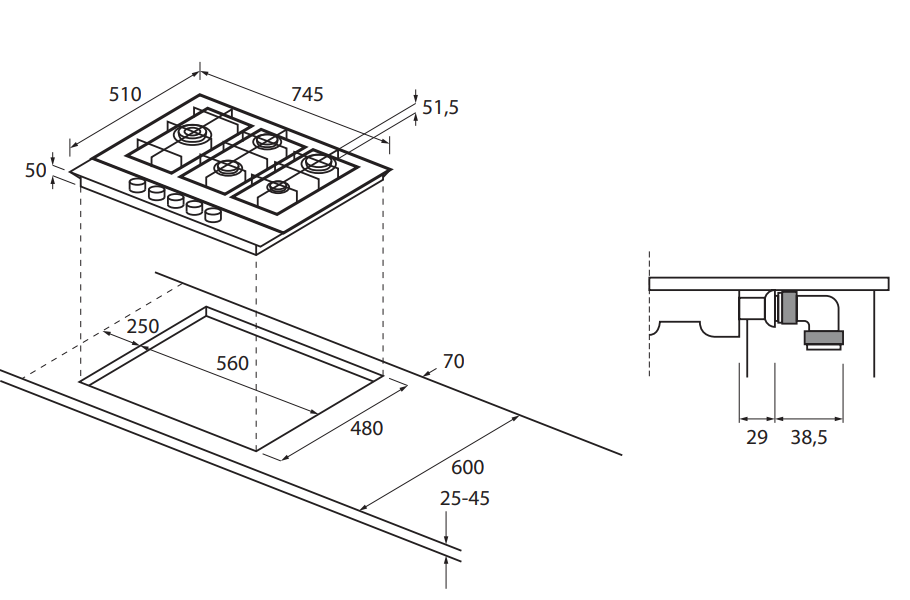 Tipo de fogão: Vitro GásNúmero total de posições a ser usadas ao mesmo tempo: 5Voltagem (V): 220-240Tipo de dispositivo de segurança para gás: Electromagnético para cada queimadorTipo da 1ª resistência: Queimador a gás duploTipo da 2ª resistência: Queimador auxiliar a gásTipo da 3ª resistência: Queimador a gás semi-rápidoTipo da 4ª resistência: Queimador a gás rápidoTipo da 5ª resistência: Queimador a gás semi-rápidoCor: PretoMaterial da superfície: Vidro temperadoTipo de dispositivos de controlo: BotõesCor dos botões: PretoTipo de grelhas: Ferro FundidoPotência da 1ª resistência (W): 4200Potência da 2ª resistência (W): 1000Potência da 3ª resistência (W): 1500Potência da 4ª resistência (W): 2700Potência da 5ª resistência (W): 1500Espaço necessário para a instalação (mm): 480x560x42Altura do produto (mm): 95Largura do produto (mm): 745Profundidade do produto (mm): 510