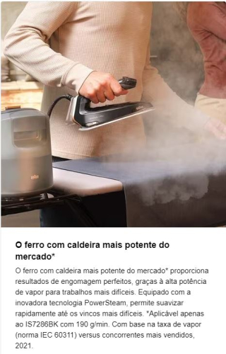 O novo CareStyle 7 Pro é o ferro com caldeira mais potenteda Braun* – fornece até 190 g/min de vapor contínuo* graças à sua inovadora tecnologia PowerSteam. Descubra um nível superior de qualidade de engomagem e características inovadoras que lhe permitem realizar esta tarefa de forma fácil e rápida, mesmo em tecidos mais resistentes e nos vincos mais difíceis.