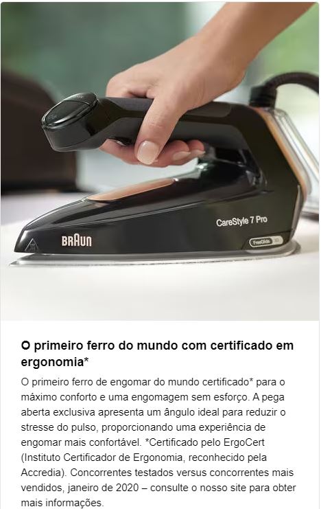 O primeiro ferro do mundo com certificado em ergonomia, para máximo conforto e engomagem sem esforço*. Certificado pelo Ergocert (Instituto Certificador de Ergonomia, reconhecido pela Accredia). Concorrentes testados versus concorrentes mais vendidos, janeiro de 2020.