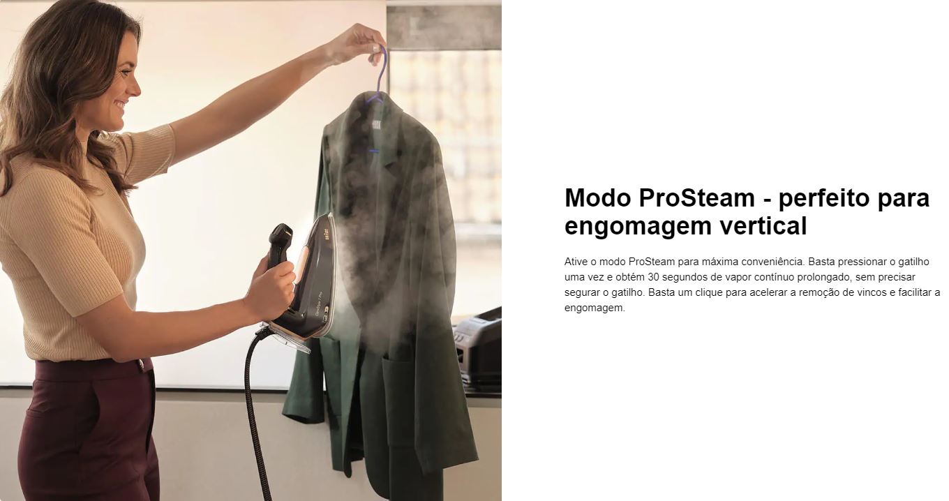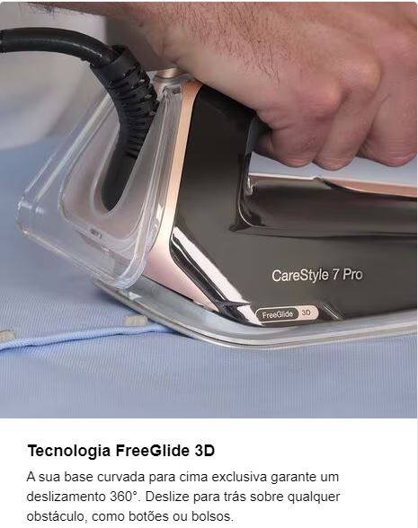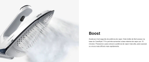 O novo CareStyle 7 Pro é o ferro com caldeira mais potenteda Braun* – fornece até 190 g min de vapor contínuo* graças à sua inovadora tecnologia PowerSteam. Descubra um nível superior de qualidade de engomagem e características inovadoras que lhe permitem realizar esta tarefa de forma fácil e rápida, mesmo em tecidos mais resistentes e nos vincos mais difíceis.