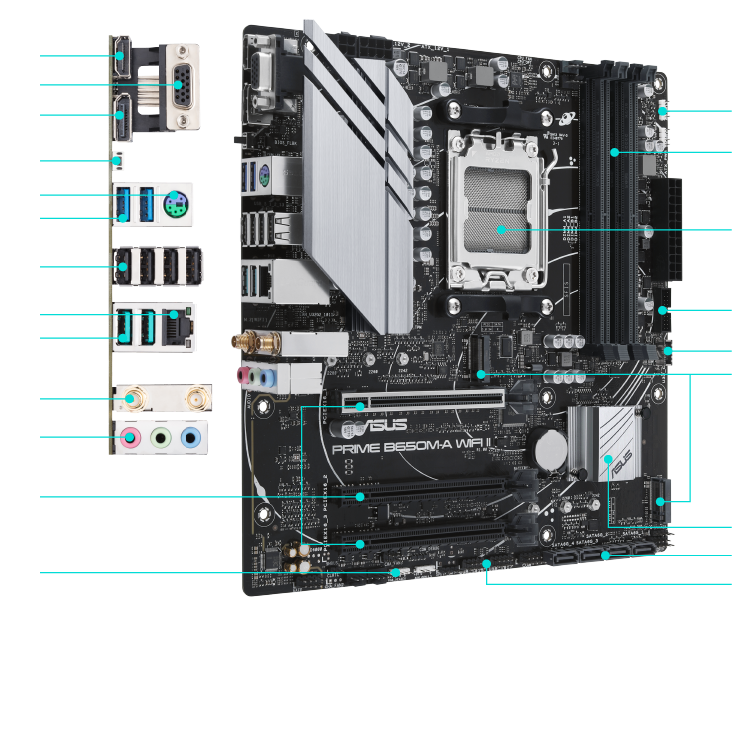 Com um design de energia robusto, soluções de resfriamento abrangentes e opções de ajuste inteligentes, o PRIME B650M-A WIFI oferece aos usuários e construtores de PC DIY uma variedade de otimizações de desempenho por meio de software intuitivo e recursos de firmware.