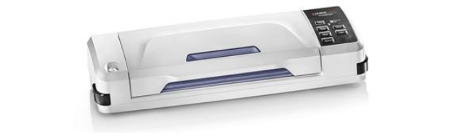 Simples e automático. Vigia para verificar a posição correta do saco. Bandeja de retenção de líquidos removível e lavável na máquina de lavar louça. Fácil de usar com o sistema de bloqueio e desbloqueio. Barra de vedação de alumínio profissional. Compartimento para suporte de rolo com cortador de saco bidirecional integrado. Função de aspiração manual para alimentos frágeis e delicados. Barra de vedação: 30 cm. Em conformidade com a diretiva ErP para consumo de energia. Inclui: guia para guardar alimentos em vácuo, jarra e tubo de corte alojados no interior da tampa, rolo para sacos de 30x300 cm e 5 sacos pré-cortados de 20x30 cm. Potência: 130 W. Fonte de alimentação: 230 V ~ 50 Hz. Litros/minuto: 10. Valor da bomba vazia: 60 cm/Hg - 0,80 bar/-11,6 PSI. > utensílios de cozinha14190NovoProduto disponívelCaracterísticas técnicas: