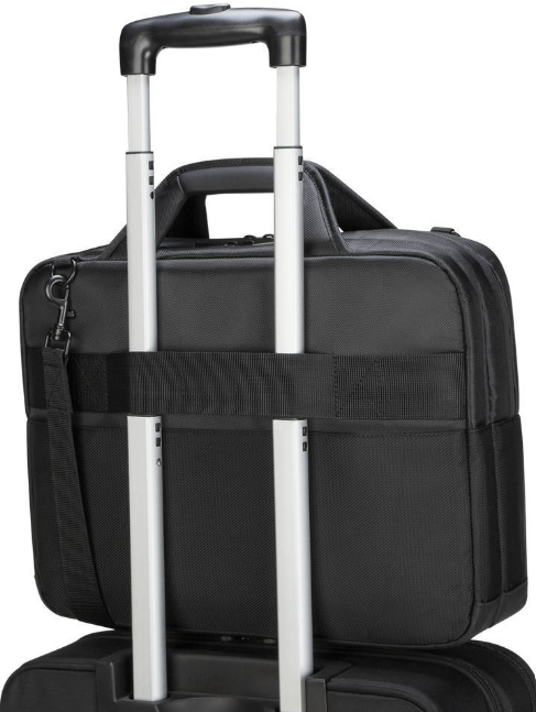 Características; Bolsa versátil para laptop para transportar sua tecnologia; o caso de transporte perfeito; Sistema de Proteção de Cúpula; camadas de absorção de choque dissipam a pressão no interior do laptop e tablet; Compartimentos para laptop e tablet; Compatibilidade Multi-Fit: Compatível com laptops de 12" a 14"; Alça de mão acolchoada e alça de ombro acolchoada; Bolsos e compartimentos de malha com zíper para organização inteligente; Alça de carrinho.