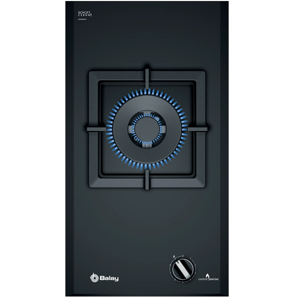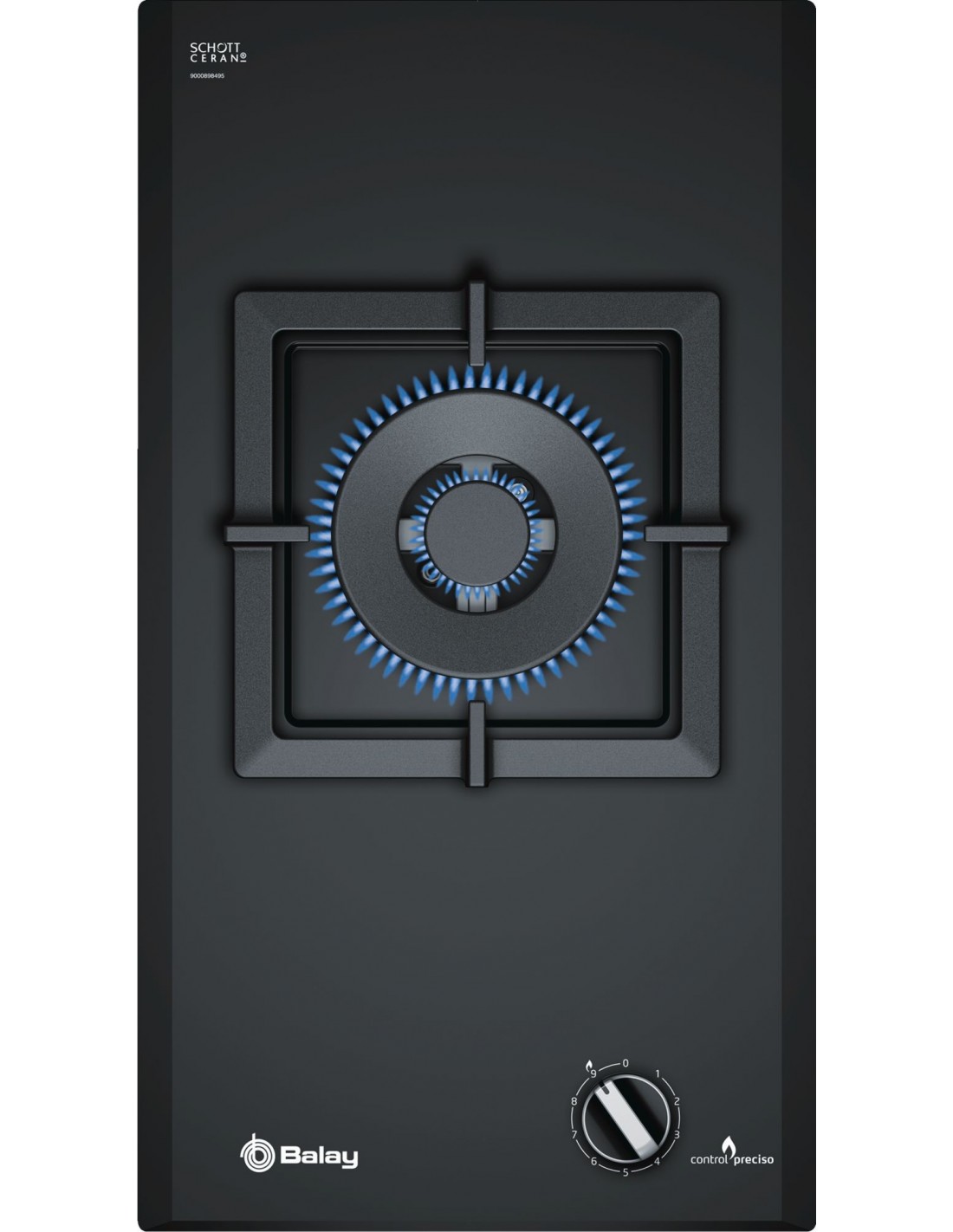Balay 3ETG631HB. Cor do produto: Preto, Local de colocação: Embutido, Tipo de boca: Gás. Tipo de controlo: Rotativo, Posição de controlo: Superior direita. Potência (gás): 4000 W, Voltagem de entrada AC: 220-240 V, Tipo de gás: Propano butano. Largura: 288 mm, Profundidade: 522 mm, Altura: 45 mm - Balay