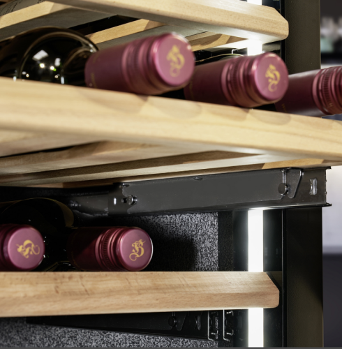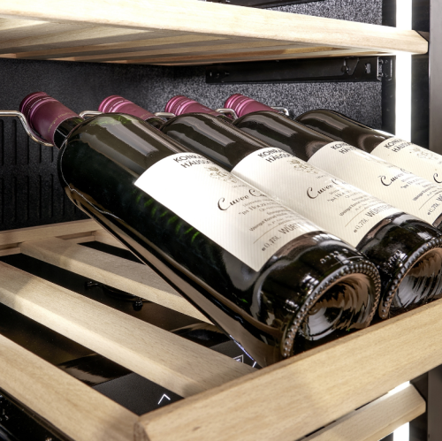 Três prateleiras de madeira amovíveis com corrediças de rolamentos de esferas, uma das quais com um dispositivo para apresentar os seus melhores vinhos