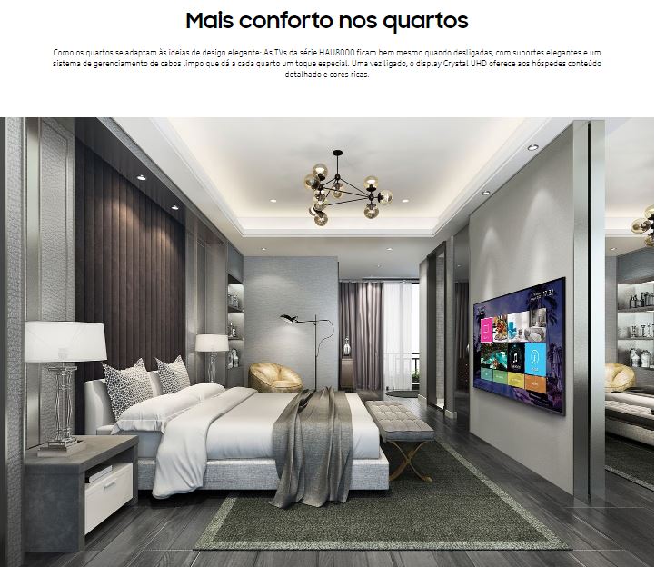 Como os quartos se adaptam às ideias de design elegante: As TVs da série HAU8000 ficam bem mesmo quando desligadas, com suportes elegantes e um sistema de gerenciamento de cabos limpo que dá a cada quarto um toque especial. Uma vez ligado, o display Crystal UHD oferece aos hóspedes conteúdo detalhado e cores ricas.