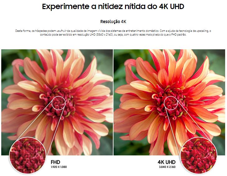 Desta forma, os hóspedes podem usufruir da qualidade de imagem vívida dos sistemas de entretenimento doméstico. Com a ajuda da tecnologia de upscaling, o conteúdo pode ser exibido em resolução UHD (3840 x 2160), ou seja, com quatro vezes mais pixels do que o FHD padrão.