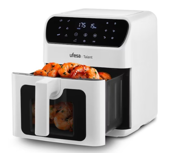 Pés antiderrapantes > air fryer10790NovoProduto disponívelA fritadeira a ar Talent tem uma capacidade de 6,5 L, perfeita para famílias de até cinco pessoas. O design da cuba possui uma janela com uma luz interior que lhe permitirá ver o estado da cozedura. O controlo do tempo e da temperatura é digital. Dispõe de um temporizador de até 60 minutos e de um controlo de temperatura de até 200 ºC. Crie as suas receitas com os seus próprios tempos e graus ou escolha um dos treze programas predefinidos: carne, frango, peixe, desidratar, bacon, descongelar, batatas fritas, legumes, piza, marisco, assar, pré-aquecer e manter quente. As suas receitas, agora mais saudáveis, graças à tecnologia 360º de circulação de ar a alta velocidade, ficarão perfeitas e com resultados estaladiços.