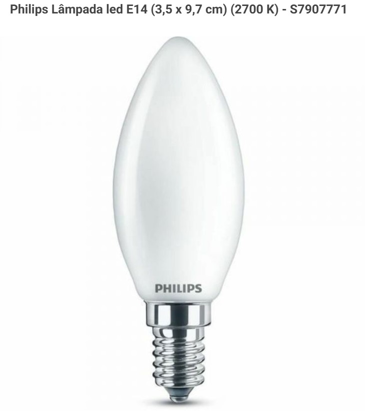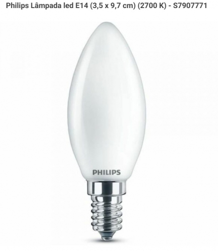 Se gosta de tratar de cada detalhe do seu lar e estar na moda em produtos que lhe vão facilitar a vida, compre Lâmpada LED Philips E14 (3,5 x 9,7 cm) (2700 K) ao melhor preço.Tipo: VelaTampa: E14Temperatura de cor: 2700 K2700kMedidas aprox.: 3,5 x 9,7 cmCor: MulticolorBranco quenteCaracterísticas: Leve LEDClassificação energética: FForma: VelaVoltagem: 240 V220-240 VFrequência: 50 - 60 HzPotência: 4,3 W > lampadas490NovoProduto disponívelSe gosta de tratar de cada detalhe do seu lar e estar na moda em produtos que lhe vão facilitar a vida, compre Lâmpada LED Philips E14 (3,5 x 9,7 cm) (2700 K) ao melhor preço.Tipo: VelaTampa: E14Temperatura de cor: 2700 K2700kMedidas aprox.: 3,5 x 9,7 cmCor: MulticolorBranco quenteCaracterísticas: Leve LEDClassificação energética: FForma: VelaVoltagem: 240 V220-240 VFrequência: 50 - 60 HzPotência: 4,3 W