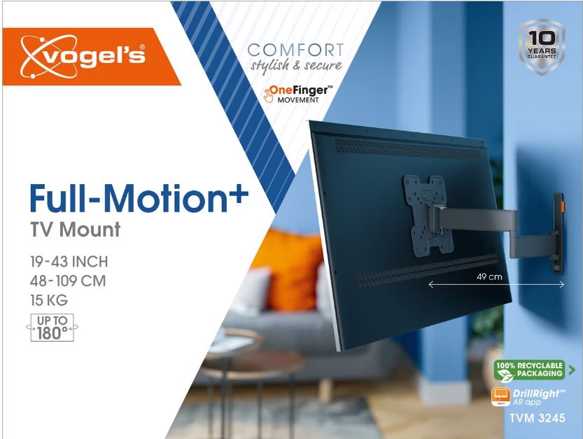 Estão incluídos, por exemplo, um molde de perfuração, parafusos, buchas Fischer® DuoPower, nível de bolha e abraçadeiras de cabo. Para marcar o primeiro furo, utilizar a aplicação RA DrillRight™ gratuita da Vogel. Este televisor Vogel COMFORT Full-Motion+ de montagem na parede vem com uma garantia de 10 anos. Quando se trata de segurança, a montagem na parede de um televisor Vogel COMFORT Full-Motion+ é uma aposta segura. O suporte de parede da TV é certificado pela TÜV e foi testado com o triplo da sua capacidade máxima de peso.