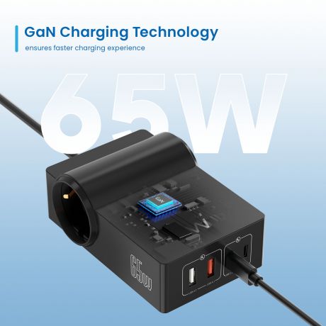 Estação de carregamento USB GaN de 65 W com extensor de 2 tomadas