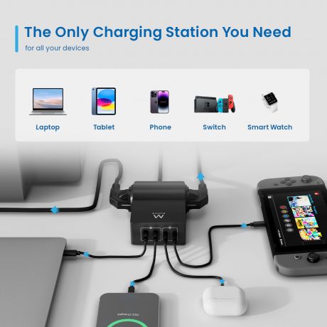 A estação de carregamento EW3992 da Ewent é GaN Fast. GaN significa Nitreto de Gálio, que é um tipo de material usado para fazer eletrônica de potência. GaN usa o material para aumentar a eficiência do carregador e reduzir o tamanho e o peso do carregador. PD significa Power Delivery, que é uma tecnologia que permite que os dispositivos sejam carregados em uma potência mais alta, permitindo um tempo de carregamento mais rápido.