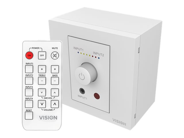 VISION Techconnect Faceplate Audio Amplifier - LIFETIME WARRANTY - 2 x 25w (RMS @ 8 Ohms) - Two inputs (input 1 duplicated on front) - Remote control - comes on at preset level or resume previous volume - UK surround and backbox included - can drive two p