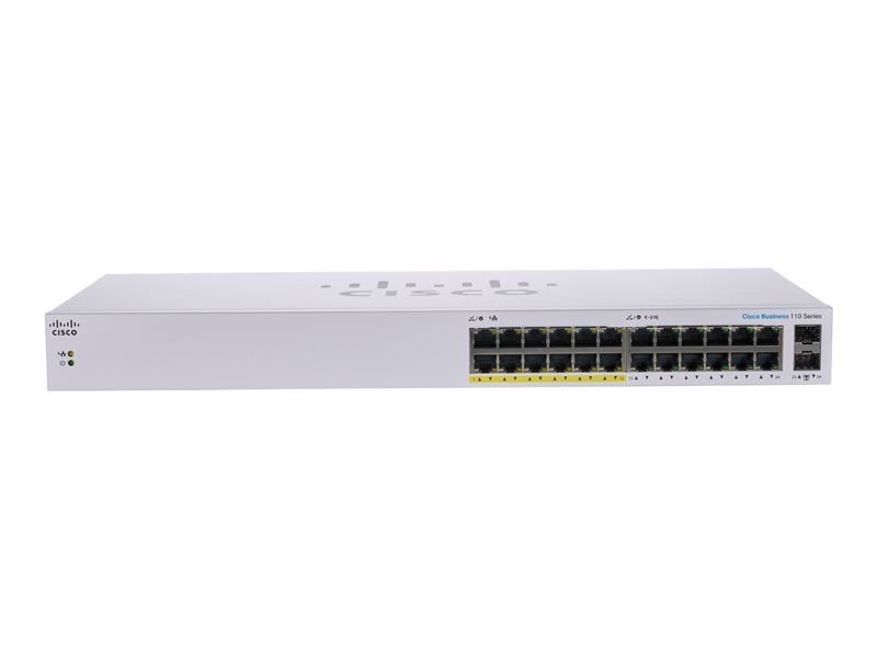 Descrição do produto Cisco Business 110 Series 110-24PP - interruptor - 24 portas - sem gestão - montável em trilho
