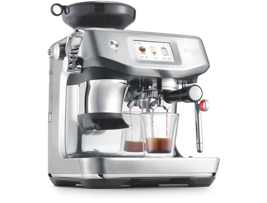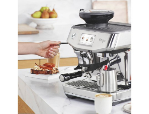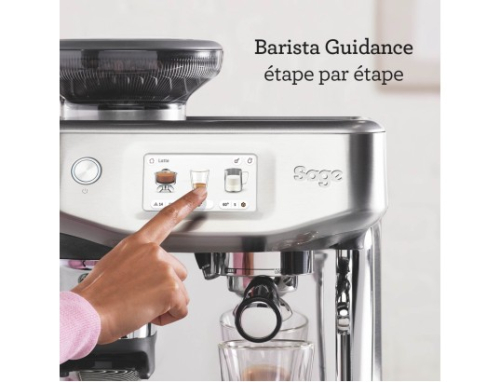 A máquina de café expresso BARISTA TOUCH IMPRESS da SAGE possui compactação assistida com sistema rotativo de 7" estilo Barista que permite impressões precisas de 10 quilos para uma pedrinha polida.