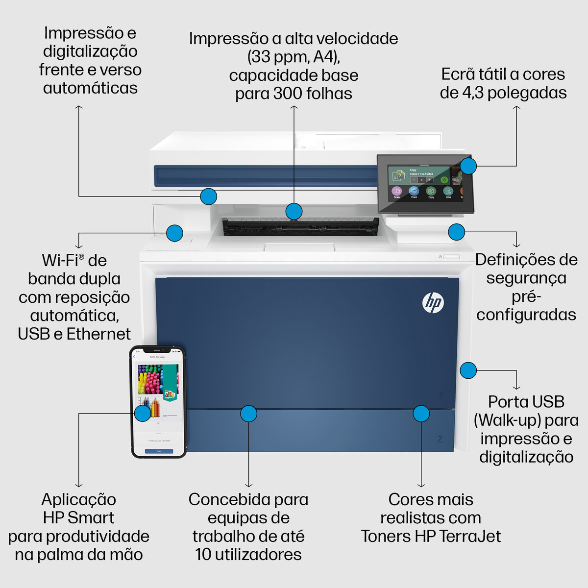 | Velocidade máxima de impressão | Até 33 ppm (mono) / até 33 ppm (cor) |