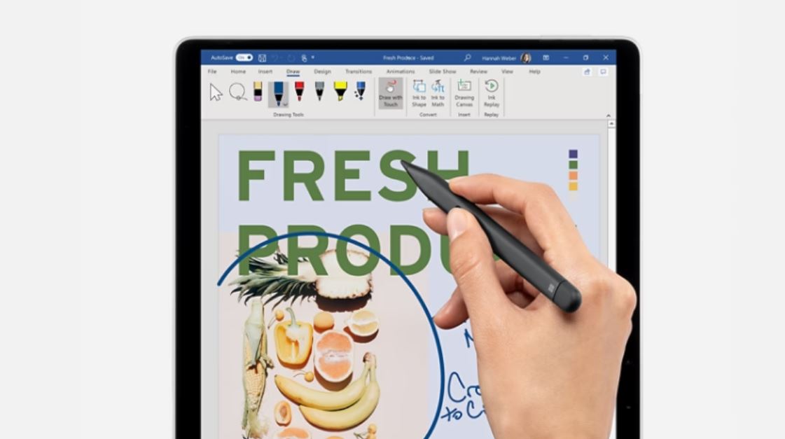Crie seu melhor trabalho no Adobe Fresco, Photoshop e muito mais, e colabore e faça anotações manuscritas juntos no Microsoft Teams. Capture ideias não estruturadas usando o Microsoft Whiteboard e pinte simultaneamente com outras pessoas. Use o Ink Editor no Microsoft Word ou use o botão superior como um clicker de apresentação de slides para avançar no Microsoft PowerPoint