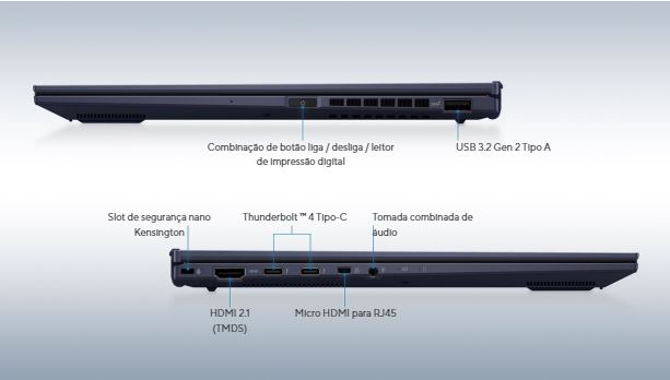 Apesar de seu perfil fino, o ExpertBook B9 OLED é carregado com portas de E S. Isso inclui o Thunderbolt ™ 4 de última geração , a próxima geração da solução universal de conectividade por cabo que oferece suporte para a interface USB 4 de próximo nível, velocidades de transferência de dados de 40 Gbps, saída de vídeo 4K e carregamento rápido. O laptop oferece USB Tipo A e saída HDMI, além de conectividade de rede com fio com passagem de endereço MAC para fácil gerenciamento de dispositivos. ExpertBook B9 OLED suporta até três monitores externos 4K.