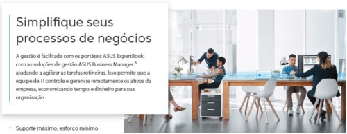 A gestão é facilitada com os portáteis ASUS ExpertBook, com as soluções de gestão ASUS Business Manager 6 ajudando a agilizar as tarefas rotineiras. Isso permite que a equipe de TI controle e gerencie remotamente os ativos da empresa, economizando tempo e dinheiro para sua organização.