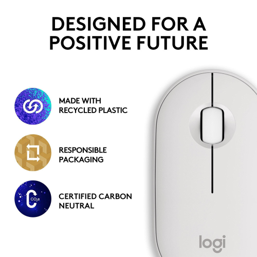 Não nos limitamos a um design único, certificamo-nos de que os nossos produtos também são fabricados de forma responsável. O Pebble Mouse 2 está disponível numa gama de cores fabricadas com mais de 50% de plástico reciclado, para que possa escolher uma cor que se adeqúe à sua vibração.