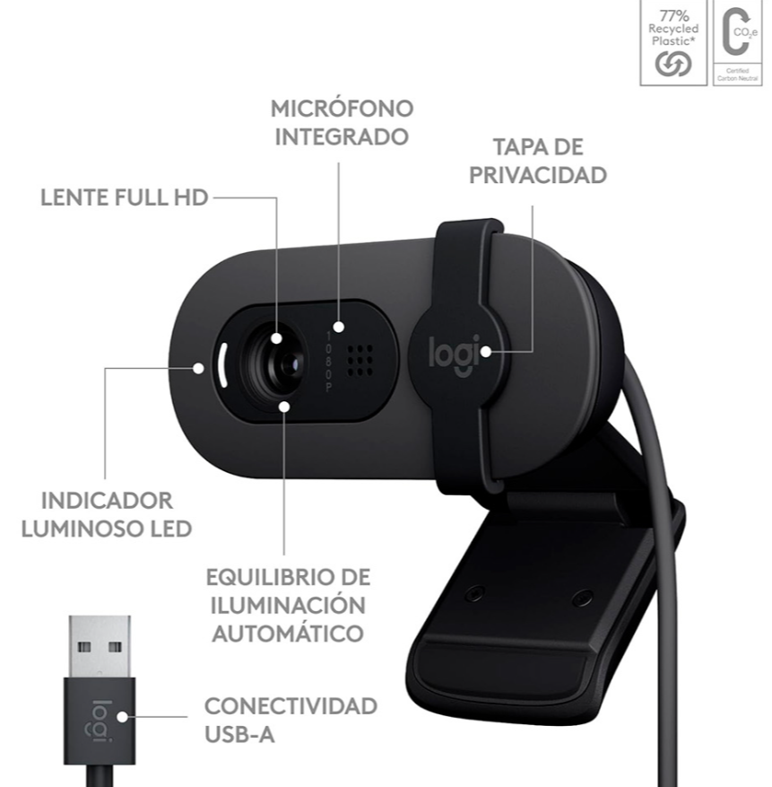 Obtenha melhores chamadas de vídeo com Full HD, equilíbrio de iluminação automático e um microfone integrado além de um obturador de privacidade. TENHA UMA MELHOR APARÊNCIA. VISUAL MAIS CLARO. A resolução Full HD 1080p oferece melhor clareza para chamadas melhores. APARÊNCIA 50% MAIS BRILHANTE, O RightLight aumenta o brilho em até 50%, reduzindo as sombras, para que você tenha a melhor aparência - em comparação com as webcams Logitech da geração anterior. TENHA PRIVACIDADE TOTAL, Cuidadosamente desenhada para o seu trabalho em casa, a proteção de privacidade integrada proporciona privacidade de confiança. Quando o dia terminar, dê um deslize no obturador para maior tranquilidade. SOE MELHOR, Um microfone embutido e conveniente garante que você seja ouvido claramente em videochamadas, para que você possa ter a melhor aparência possível e sem complicações. PLUG AND PLAY NA SUA PLATAFORMA, A Brio 100 é compatível com a maioria das plataformas de chamadas, como Microsoft Teams, Google Meete Zoom, e com a maioria dos sistemas operacionais como Windows, macOSe ChromeOS. FABRICADO PELA LOGITECH, A Logitech é uma marca de confiança em webcams, com décadas de inovação em design, garantindo alta qualidade e durabilidade..