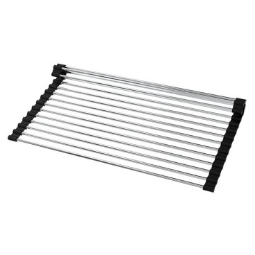 Escorredor de louça em aço inoxidável, que pode ser arrumado de forma bastante fácil e compacta.