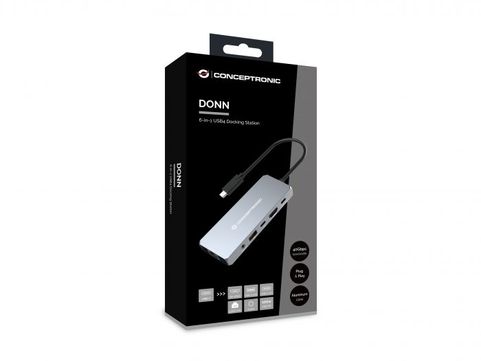 Invólucro de alumínio para dissipação de calor > portateis acessorios7590NovoProduto disponívelEstação de acoplamento USB4 6 em 1 DONN22G, 40 Gbps, 8K 60 Hz HDMI, 2,5 GbE, USB-A 10 Gbps, USB-C 10 Gbps, 100 W USB PD, áudio