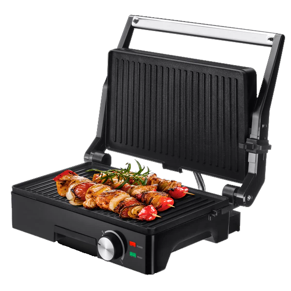 - Inclui um termóstato regulável, permitindo ajustar a temperatura conforme necessário para diferentes tipos de grelhados, desde carnes a vegetais.