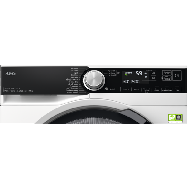 PowerClean 59min, Eco 40-60, Algodões, Sintéticos, Delicados, Lãs, 20Min 3Kg, Vapor, Desporto, Hygiene, Enxaguamento, Centrifugação / Drenagem