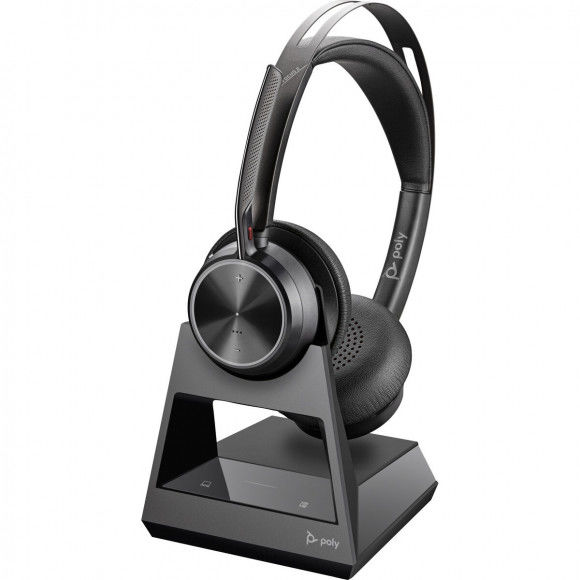 POLY Voyager Focus 2 USB-C com fone de ouvido com suporte de carga.