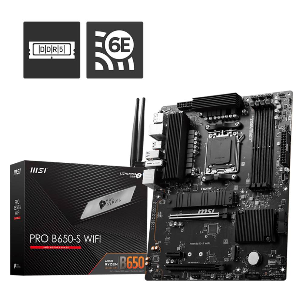 MSI PRO B650-S WIFI. Fabricante do processador: AMD, Socket do processador: Ranhura AM5, Processador: AMD Ryzen 7 7th Gen, AMD Ryzen 9 7th Gen. Tipos de memórias compatíveis: DDR5-SDRAM, Memória interna máxima: 192 GB, Velocidades de relógio de memória compatíveis: 7200, 7000, 6800, 6600, 6400, 6200, 6000, 5800, 5600, 5400, 5200, 5000, 4800 MHz. Interfaces de armazenamento suportadas: M.2, SATA, Níveis RAID: 0, 1. Tipo de interface ethernet: 2.5 Gigabit Ethernet, Controlador LAN: Realtek RTL8125-BG, Padrão Wi-Fi máximo: Wi-Fi 6E (802.11ax). Componente para: PC, Forma da motherboard: ATX, Família de chipset da placa-mãe: AMD