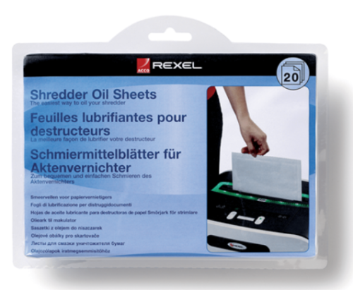 Projetado para prolongar a vida da sua trituradora, Shredder Oil Sheets é a maneira mais fácil de lubrificar a sua trituradora, distribuindo a quantidade certa de óleo a cada vez. Disponível em pacotes de 12 ou 20 folhas A5, seguros para uso com todos os modelos de trituradora.