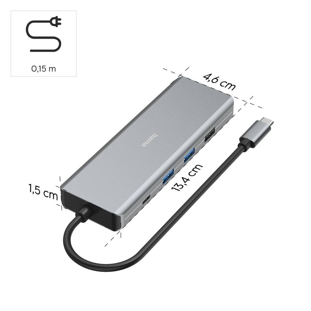 Hama CONNECT2Media. Interface do host: USB Type-C, Interfaces de hub: HDMI, RJ-45, USB 3.2 Gen 1 (3.1 Gen 1) Type-A, USB 3.2 Gen 2 (3.1 Gen 2) Type-C. Velocidade real de transferência: 5000 Mbit s, Resolução máxima (HDMI): 4096 x 2160 pixels, Cor do produto: Cinza. Tipo de interface ethernet: Gigabit Ethernet, Taxa de transferência de dados Ethernet LAN: 10,100,1000 Mbit s. Tipo de fonte de alimentação: USB. Largura: 134 mm, Profundidade: 46 mm, Altura: 15 mm