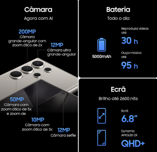 Bem-vindo à nova era da inteligência artificial com o Galaxy S24 Series, o primeiro telefone com IA da Samsung. A série Galaxy S24 foi criada para revolucionar a indústria, iniciando uma nova era para os telefones. Graças à tecnologia exclusiva Galaxy AI, a forma como utiliza o seu dispositivo irá mudar, facilitando todas as suas tarefas diárias.