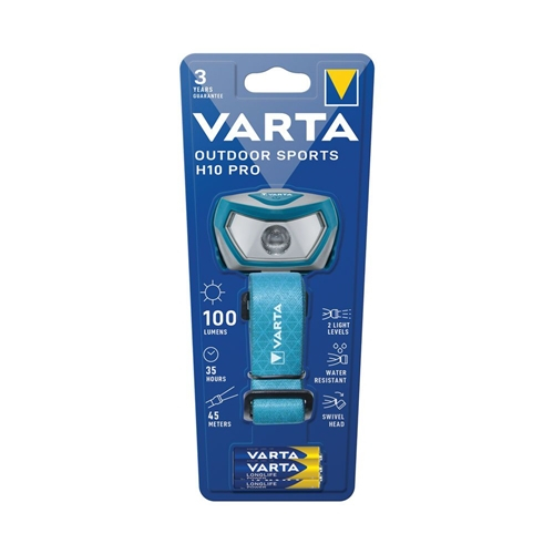 A lanterna de cabeça Varta Outdoor Sports H10 Pro é uma lanterna de cabeça robusta para desportos ao ar livre com até 100 lúmenes. Possui uma cabeça giratória para uma iluminação óptima do ambiente. É cómoda e muito confortável de usar graças à correia de cabeça ajustável, amovível e lavável. Existem dois níveis de luz: alto e baixo. A lanterna de cabeça é resistente a choques até 2 m, é resistente à água (IPX4) e funciona com 3 pilhas AAA incluídas.