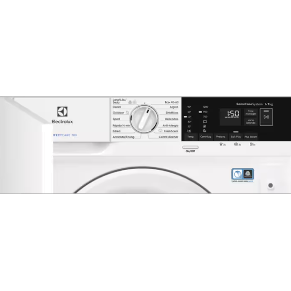 Funções: Ligar/Desligar, Seletor de temperatura, Centrifugação, Pré-lavagem, Soft Plus, Vapor Plus, Início diferido, Time Manager, Início/Pausa |