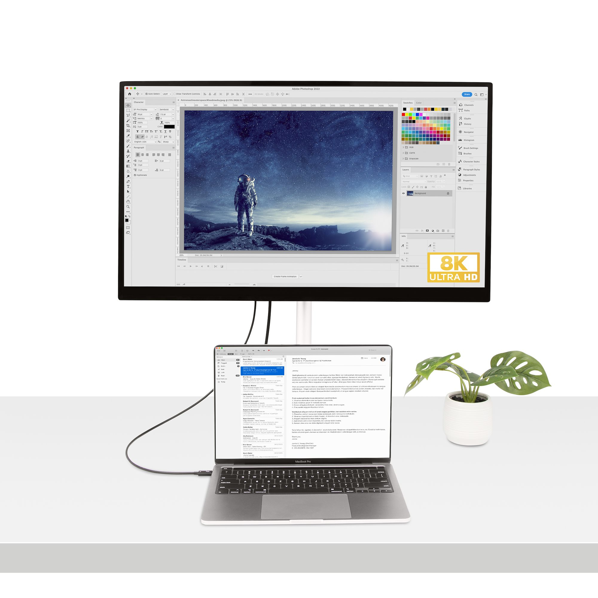 Cabo Thunderbolt 4 - 40 Gbps - 100 W PD - Vídeo 4K 8KEste cabo Thunderbolt 4 (40 Gbps) permite sinais Thunderbolt 4 em conectores USB Tipo C. Forneça vídeo, dados e até 100 W de fornecimento de energia para dispositivos Thunderbolt, USB e DisplayPort. 40 Gbps para dispositivos Thunderbolt 4 3 Este cabo suporta transferência de dados de 40 Gbps quando conectado a um Thunderbolt 4, Thunderbolt 3 ou compatível com USB4 fonte e dispositivo. Ele é capaz de transferir arquivos de foto e vídeo quatro vezes mais rápido do que os cabos USB 3.2 gen 2 (10 Gbps) padrão. Compatível com USB-C O cabo Thunderbolt 4 é compatível com todos os dispositivos USB Tipo C e pode ser usado para carregar e sincronizar dispositivos móveis. Além disso, este cabo pode ser usado para conectar e alimentar laptops USB-C, como MacBook® e Chromebook; e periféricos USB-C, como discos rígidos portáteis e estações de acoplamento. Vídeo Full-8KO cabo suporta vídeo full-8K 60Hz e DisplayPort 1.4a e é compatível com monitores DisplayPort. Use-o para conectar uma estação de acoplamento a um laptop ou um laptop a um monitor. Fornecimento de energia USB Este cabo Thunderbolt 4 fornece até 100 W de fornecimento de energia para carregar um laptop ou alimentar um monitor e 15 W para dispositivos alimentados por barramento, como gabinetes de disco rígido. Rede ThunderboltO cabo pode ser usado para conectar em cadeia até 6 dispositivos habilitados para Thunderbolt 4, como laptops para rede 10GbE ponto a ponto. Além disso, conecte dois laptops Thunderbolt 4 para transferir migrar dados. A vantagem do StarTech.