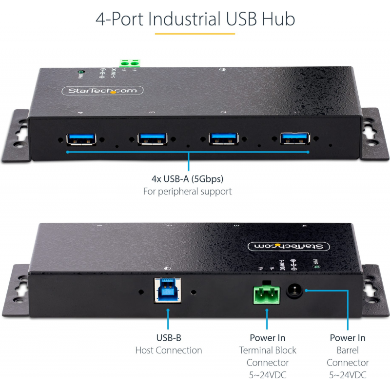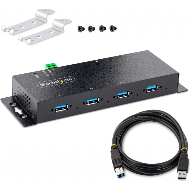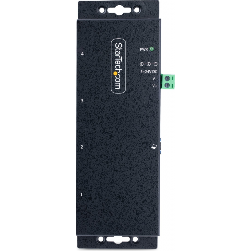 Conecte quatro dispositivos USB Type-A 3.2 Gen 1 (5 Gbps) a uma única porta USB no seu computador, usando um hub USB adequado para ambientes industriais comerciais severos ambientes Aumente a escalabilidade USB em ambientes industriais, laboratórios de produtos e reparos, salas de conferência ou estações de trabalho de escritório, usando este hub USB industrial de 4 portas. Funcional em ambientes agressivos Este hub USB industrial oferece desempenho confiável em ambientes agressivos com seu invólucro metálico resistente. Ele suporta entrada de bloco de terminais de 5 a 24 Vcc, proporcionando flexibilidade para alimentar o hub conforme necessário, com base em suas próprias opções de entrada de energia. Perfeito para ambientes de fábrica, o hub robusto possui proteção ESD sobretensão para cada porta USB, o que ajuda em evitando danos a quaisquer dispositivos conectados.Montar em uma parede, mesa ou trilho DINInstale o hub onde for mais adequado para sua aplicação. Monte com segurança o hub em uma variedade de superfícies, incluindo uma parede, mesa ou rack, usando os suportes de montagem integrados e o hardware incluído.Conecte e carregue dispositivos USBProjetado para um grande volume de conexões, este hub USB 3.0 robusto oferece quatro conexões portas, para conectar mais dispositivos periféricos USB. O hub USB industrial suporta entradas de energia CC e de bloco de terminais de 5 a 24 V CC que fornecem compatibilidade e flexibilidade em diferentes cenários, como laboratórios de produtos e reparos, salas de conferência ou estações de trabalho de escritório.StarTech.com oferece adaptadores de energia externos, ITB20D3250 e SVA12M5NA, vendidos separadamente. Com o adaptador de energia opcional, o hub suporta a especificação de carregamento de bateria USB 1.2, fornecendo até 2,4 A em qualquer porta até um máximo de 30 W no total, para que você possa carregar seus dispositivos móveis mais rapidamente do que as portas USB tradicionais permitem.Ampla compatibilidade de dispositivosO hub é independente do sistema operacional, garantindo suporte em uma ampla variedade de plataformas, incluindo Windows, macOS e Linux.5G4AINDNP-USB-A-HUB é apoiado por uma garantia de 2 anos da StarTech.com e vida útil gratuita 24 5 suporte técnico multilíngue. StarTech.com tem sido a escolha dos profissionais de TI há mais de 30 anos.A vantagem StarTech.