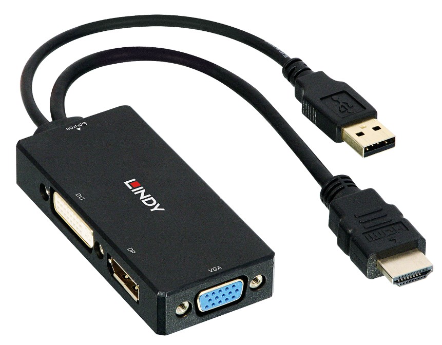 O Conversor Lindy HDMI® para DisplayPort, DVI e VGA permite que os usuários conectem uma tela DisplayPort, DVI ou VGA a uma fonte HDMI®. Com suporte para resoluções 4K de até 3840x2160 a 30 Hz em monitores DisplayPort, o conteúdo pode ser visualizado com clareza superior e precisão impressionante. Monitores DVI e VGA são compatíveis com resolução máxima de 1920x1200 a 60 Hz. O cabo USB integrado pode ser conectado a uma porta USB ou fonte de alimentação USB para alimentar o conversor.