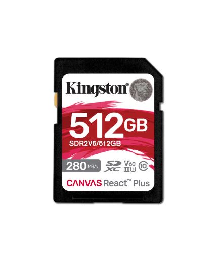 Kingston Technology 512 GB Canvas React Plus SDXC UHS-II 280R/150W U3 V60 para Full HD/4K. Capacidade: 512 GB, Tipo de cartão Flash: SDXC, Classe de memória Flash: Classe 10, Tipo de memória interna: UHS-II, Velocidade de leitura: 280 MB/s, Velocidade de gravação: 150 MB/s, Classe de velocidade UHS: Classe 3 ( U3), Classe de velocidade de vídeo: V60. Cor do produto: Preto