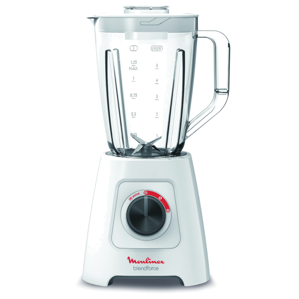 Moulinex LM420110. Capacidade da tigela: 2 l, Tipo de controlo: Rotativo. Tipo: Liquidificador, Cor do produto: Branco, País de origem: China. Material do copo misturador: Plástico, Material da lâmina: Aço inoxidável. Potência: 600 W, Fonte de alimentação: AC. Largura: 180 mm, Profundidade: 185 mm, Altura: 370 mm