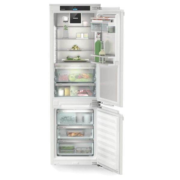 LIEBHERRFrigorifico Combinado Encastre LIEBHERR - ICBNci 5183Frigorifico Combinado Encastre LIEBHERR - ICBNci 5183Classe de eficiência energética: C | Consumo de energia ano / 24 h: 166 / 0,454 kWh | Capacidade útil total : 246 l | Capacidade útil: Refrigerador: 104,5 l / BioFresh: 70,7 l / Congelador: 71 l | Nível de ruído / Classe de emissão de ruído: 33 dB(A) / B, SuperSilent | Classe climática: SN-ST (entre +10 °C to +38 °C) | Dimensões de abertura em cm (A / L / P) 177,2-178,8 / 56-57 / min. 55 | TFT 2,4" - ecrã a cores - Tecnologia Touch & Swipe | Ecrã digital de temperatura para o frigorífico, BioFresh e congelador | SmartDeviceBox incluída | Sinal de aviso em caso de anomalia: visual e acústico | Alarme de porta: visual e acústico | Pés ajustáveis à frente | Porta de abertura reversível | Borracha substituível | Parede traseira e porta interna em aço inoxidável com SmartSteel | | COMPARTIMENTO FRIGORÍFICO E BIOFRESH | PowerCooling com Ar Novo filtrado através de carvão activado e Ambilight | Prateleira Premium GlassLine com suporte de garrafas, compartimientos VarioBox extraiveis, Bandeja de ovos ajustável, Manteigueira | 3 prateleiras GlassLine, das quais 1 são divididas | Prateleira para garrafas | Painel de luz em ambos os lados | Iluminação LED no BioFresh | 2 gavetas BioFresh-Safe com SoftTelescopic, 1 Fruit & Vegetable-Safe (fruta e vegetais) com HydroBreeze,  | 1 Meat & Dairy-Safe (carne e laticínios), 1 FlexSystem | InfinitySpring com ligação de 3/4" à rede de água | | COMPARTIMENTO CONGELADOR | 3 gavetas, das quais 2 em calhas telescópicas, VarioSpace | IceMaker com ligação de 3/4" à rede de água, Iluminação LED | Produção de gelo em 24 h: 1,2 kg | Reservatório de cubos de gelo: 5,0 kg | Iluminação LED | Armazenamento em caso de avaria: 9 hr | Capacidade de congelação em 24h: 6 kg | 2 acumuladores de frio | Acessórios em vidro de segurança > combinado333290NovoProduto disponível