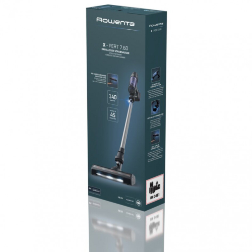 Rowenta X-Pert 7.60 RH6A35WO. Tipo de limpeza: Seco, Método de separação do lixo: Ciclónico, Fluxo de ar: 59,22 l min. Tipo de coletor de pó: Sem bolsa, Cor do produto: Roxo, Prateado, Capacidade para resíduos secos: 0,44 l. Fonte de alimentação: Bateria, Tempo de funcionamento: 45 min, Tempo de carga: 3 h. Peso: 2 kg, Largura: 240 mm, Profundidade: 248 mm. Escovas de aspirador incluídas: Escova com luzes LED